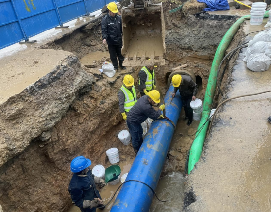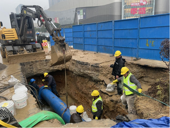 險(xiǎn)情就是命令,凌晨1點(diǎn),公司立即組織10余名搶修人員到場(chǎng)關(guān)閘止水。與此同時(shí),技術(shù)人員、施工人員和設(shè)備設(shè)施“跑步前進(jìn)”、同步到場(chǎng),對(duì)破損溢水點(diǎn)進(jìn)行邊開挖、邊診斷。為加快搶修速度,減少對(duì)周邊用戶的影響,30余名搶修人員頂著嚴(yán)寒天氣連夜搶修。