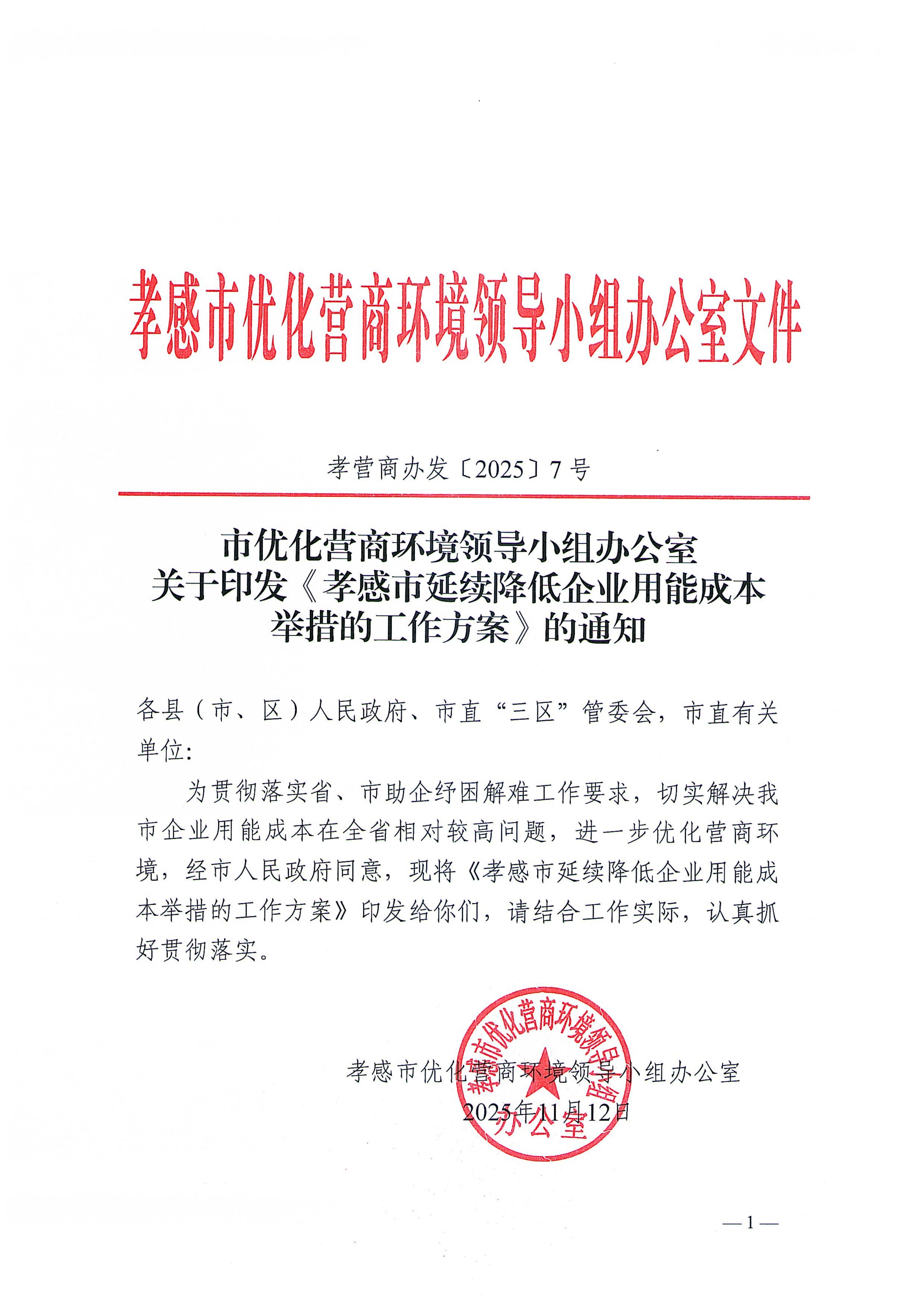 市優(yōu)化營商環(huán)境領(lǐng)導(dǎo)小組辦公室關(guān)于印發(fā)《孝感市延續(xù)降低企業(yè)用能成本舉措的工作方案》的通知