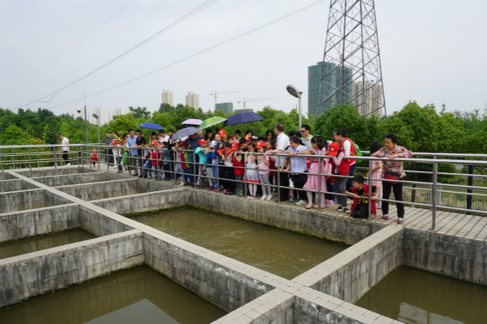 小記者們都是第一次走進水廠,對每道生產流程都非常好奇,對每件處理設施都饒有興趣,一路走一路七嘴八舌地詢問;三水廠工作人員則結合水處理流程和工作原理,用淺顯而生動的語言為他們一一講解說明,耐心細致地解答著每一個提問。在反應沉淀池上,小記者們看到了渾濁的源水由兩根巨大輸水管道輸送到絮凝反應池里,當他們得知這里的源水都是來自34公里以外的漢江時,不由得咋舌驚嘆“原來我們每天喝的自來水需要輸送那么遠的距離啊,真是太不容易了!”